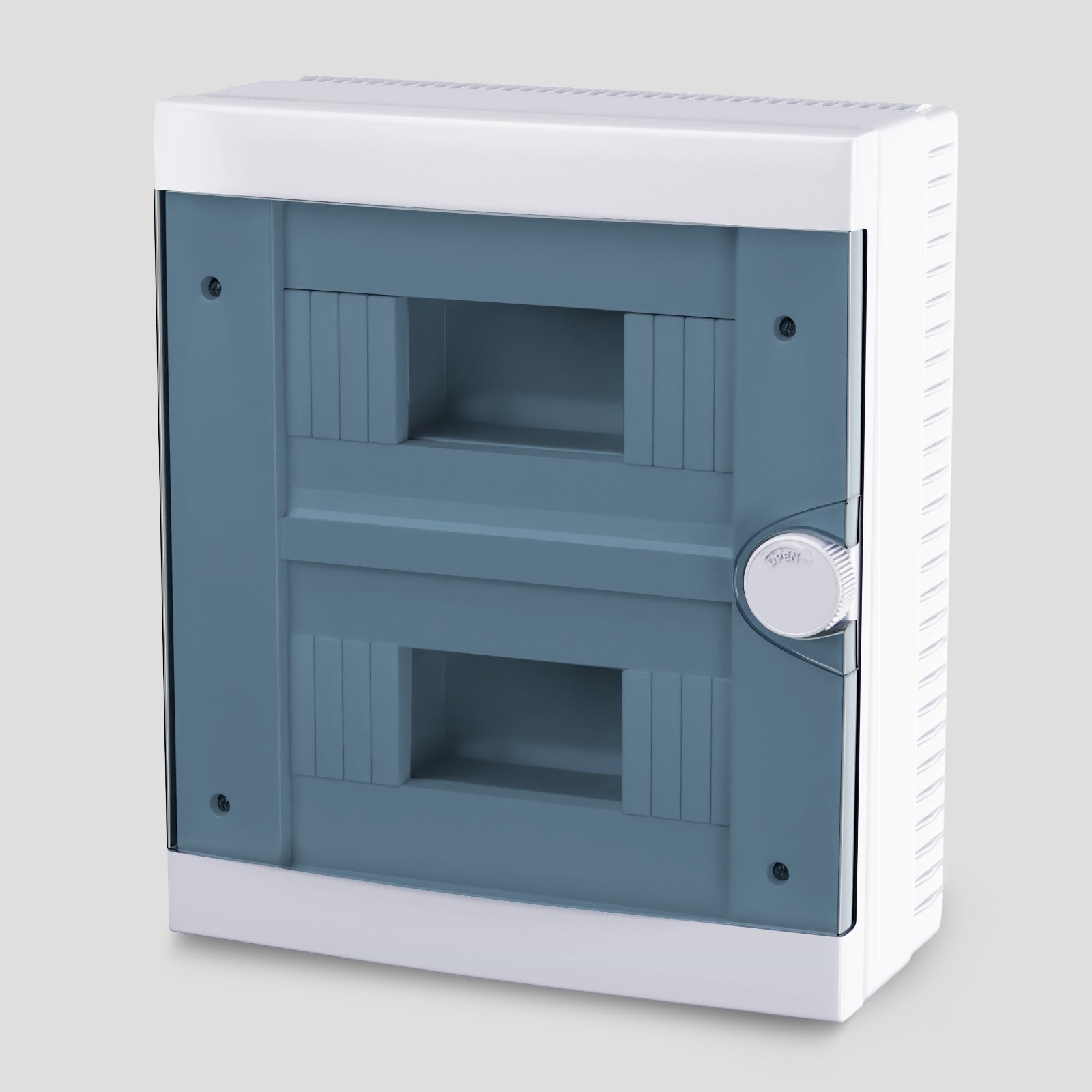 Plastová skříň se skládá z 2 řady po 8 modulech.