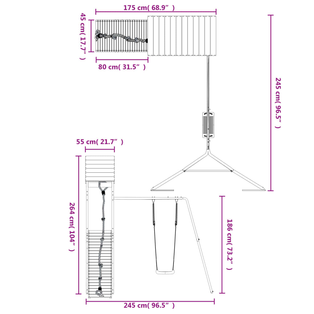 - Stabilní a robustní rám: Dřevěný rám dětského hřiště zajišťuje mimořádnou pevnost a stabilitu. Nohy dětské houpačky ve tvaru písmene A navíc zajišťují potřebnou rovnováhu.