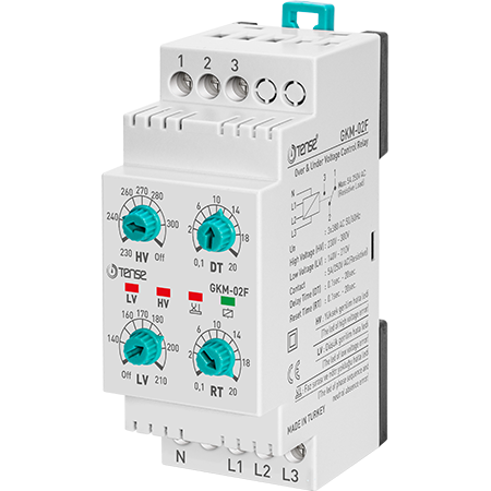Třífázové monitorovací relé GKM-02F od výrobce TENSE je určeno pro ochranu třífázových zátěží před nebezpečnými stavovými odchylkami v napájecí síti. Přístroj sleduje podpětí, přepětí, ztrátu fáze, nesprávnou fázovou posloupnost a výpadek nulového vodiče.