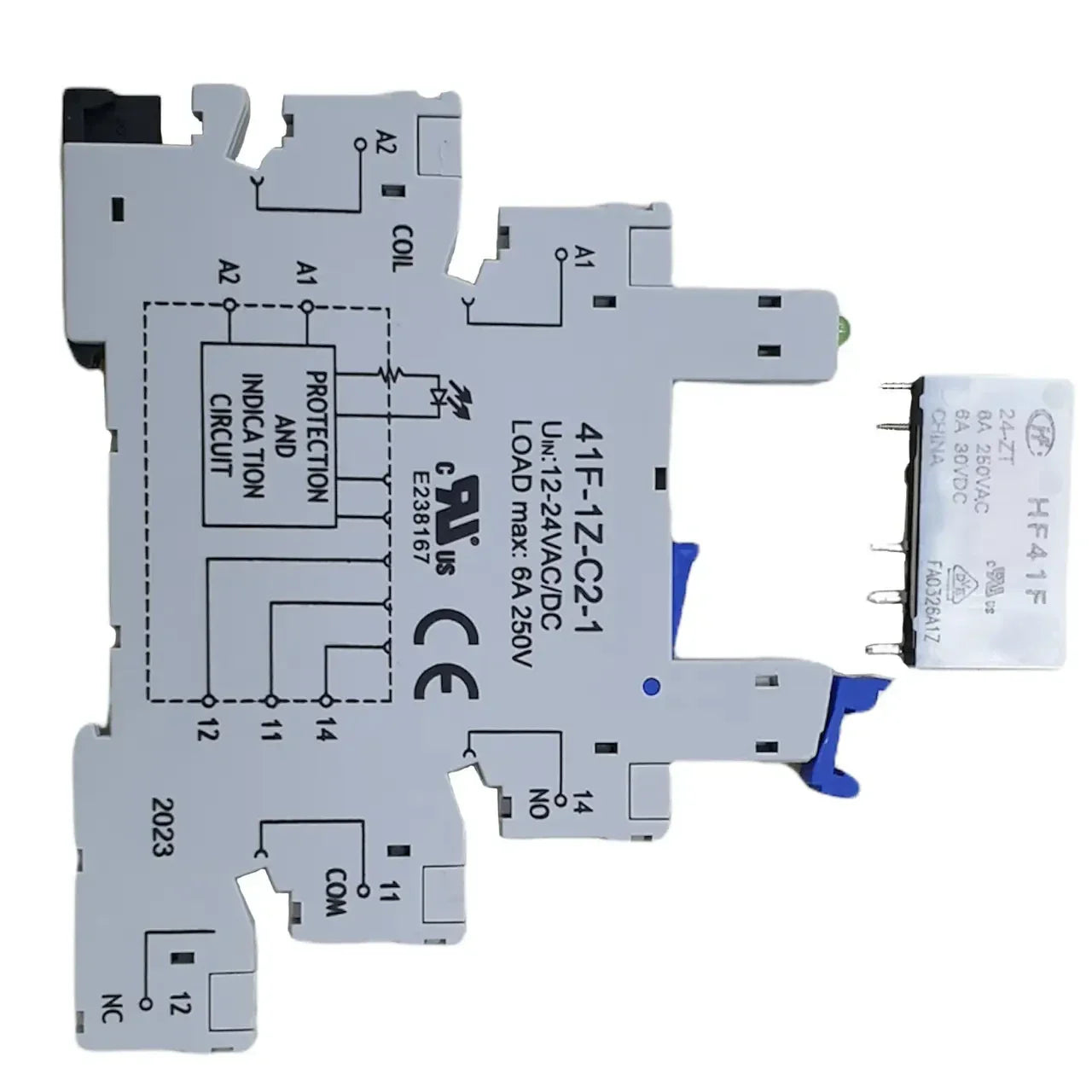 Reléové rozhraní HF-41F se skládá ze základního modulu 41F-1Z-C2-1 a zásuvného miniaturního relé HF41F/24-ZT s výkonovými kontakty.