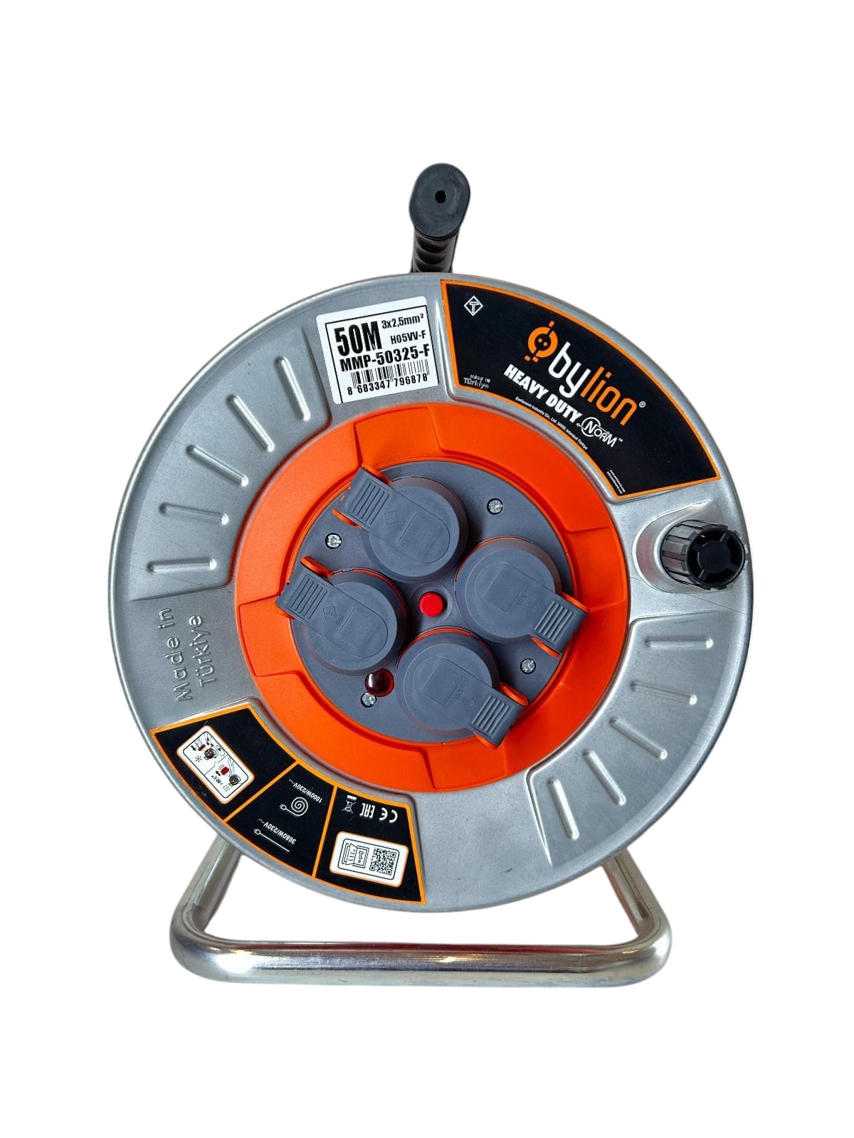 Kovový naviják s měděným kabelem ByLion MMP-50325-F – 50 m, 3×2,5 mm², kovová, 4 zásuvky, IP44