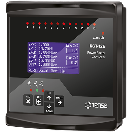 Regulátor jalového výkonu RGT-12E od společnosti TENSE je plně automatický a vysoce přesný regulátor určený pro optimální řízení kompenzačních stupňů v energetických systémech. Díky digitálnímu měření, inteligentním algoritmům a grafickému LCD displeji zajišťuje stabilní účiník, efektivní řízení jalového výkonu a ochranu kompenzačního zařízení.