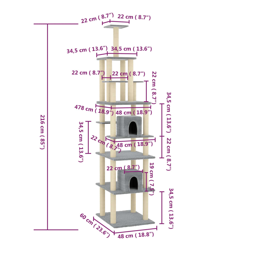 Škrabadlo pro kočky se sisalovými sloupky světle šedé 216 cm