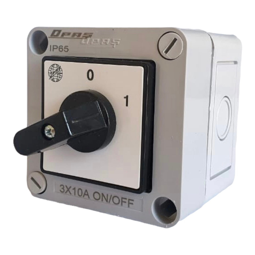 Vačkový paketový spínač v krabici IP65, ON-OFF (0–1), 3pólový — OPAS (Turecko)
